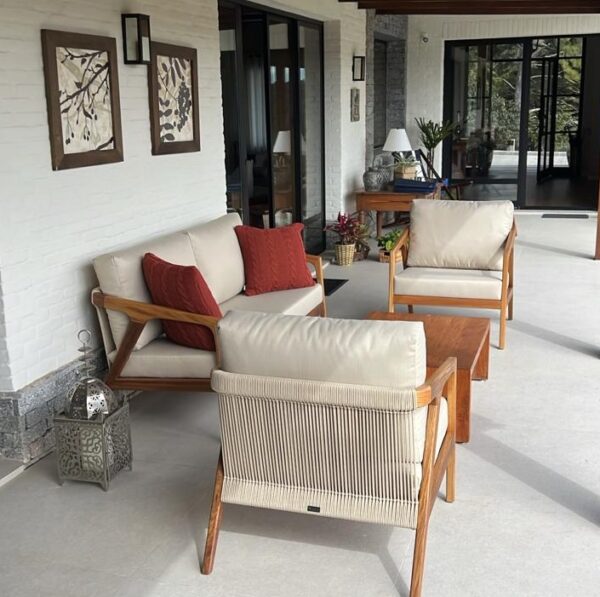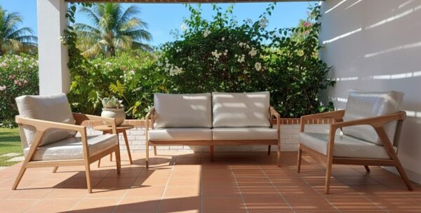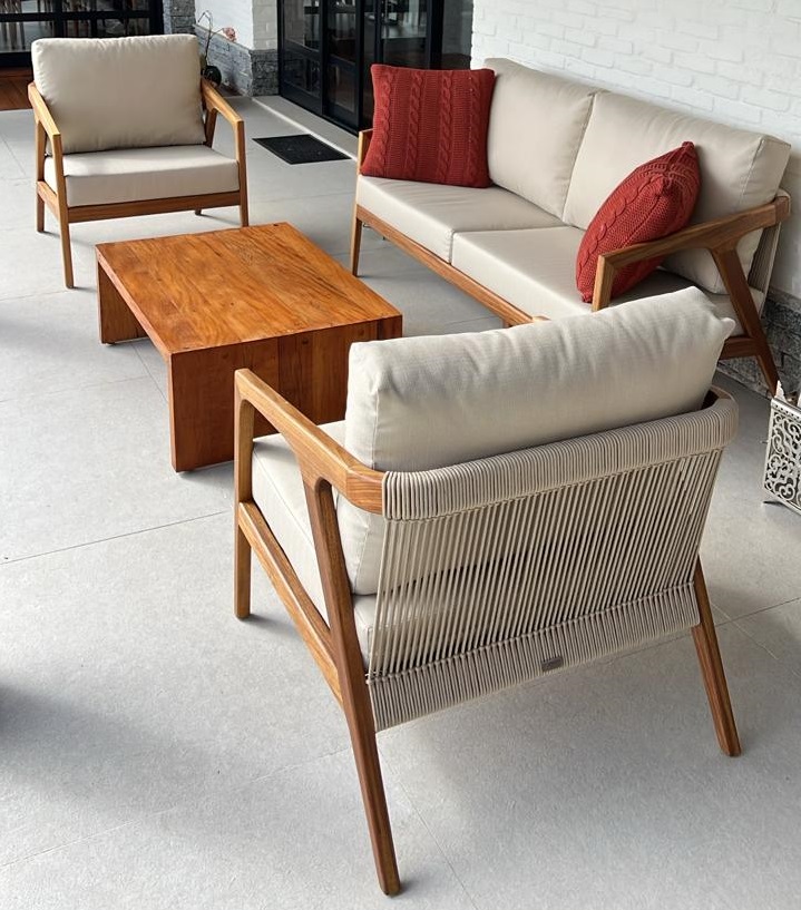 Especificações | Conjunto feito com estrutura de madeira maciça freijó e protegida com com verniz polisten,que realça a naturalidade da madeira e possui filtro solar. |